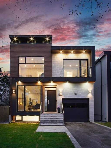 The exterior design of this custom home on Rathburn Rd in Etobicoke showcases a modern yet timeless aesthetic.