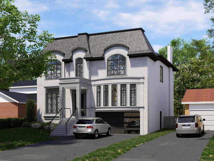 This custom home on Lauralynn Drive in Scarborough was designed as an elegant French-inspired residence featuring a distinctive mansard roof, arched dormers, and refined architectural detailing.