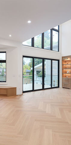 The double-height living area features expansive windows, a modern fireplace wall, custom illuminated shelving, and warm herringbone flooring. Natural light and refined finishes create an open, elegant main-floor living space