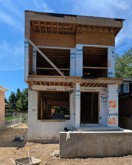 This ongoing extension project expands the home both vertically and to the rear, creating more family space while maintaining the existing foundation and structure. Cadaxx coordinated zoning, structure, and OBC compliance to obtain City approval before construction began.