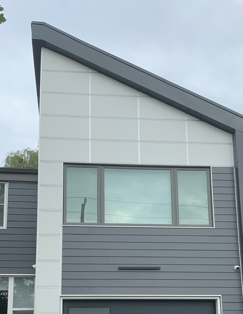 The home is clad in two tones of horizontal gray siding, with a darker shade for the lower section and a lighter, vertical panelling for the garage facade, providing a clean, layered look.